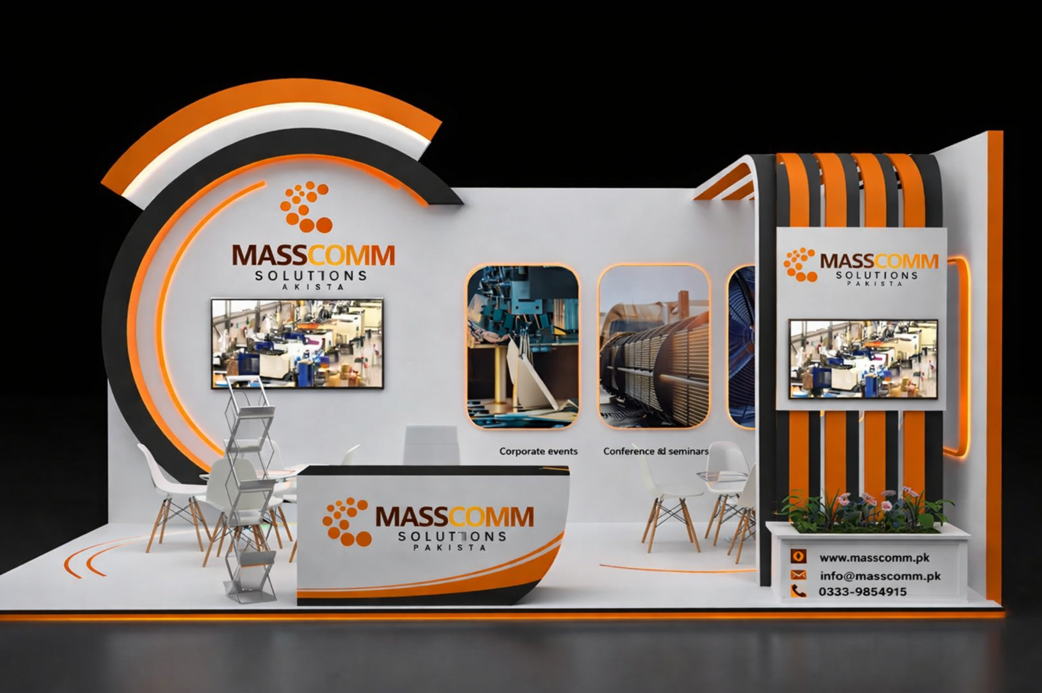 Present your brand with confidence using this 200 square feet (10×20 ft) premium exhibition stall, designed and executed by MassComm Solutions Pvt. Ltd.. This stall is a perfect blend of modern aesthetics, smart space utilization, and strong brand visibility—ideal for corporate exhibitions, trade shows, and expos.